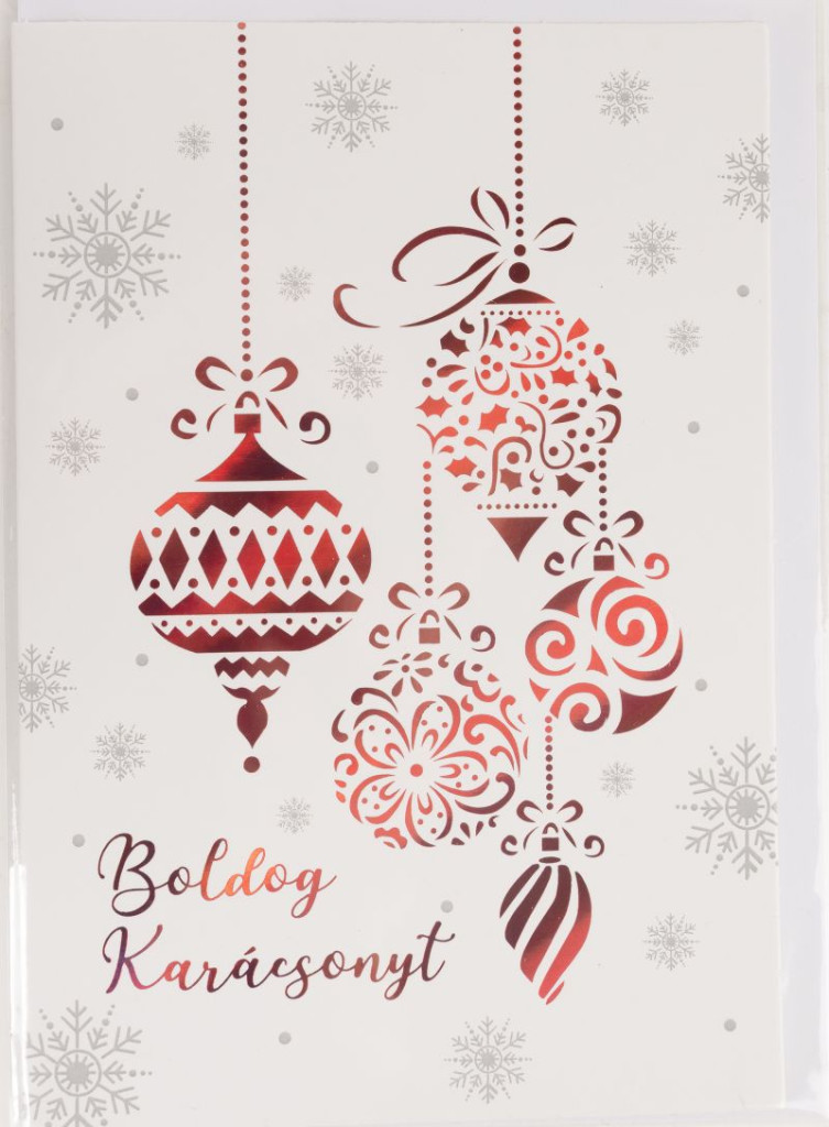 KÉPESLAP+BORÍTÉK, PIROS FÜGGŐ DÍSZEK, BOLDOG KARÁCSONYT FELIRAT