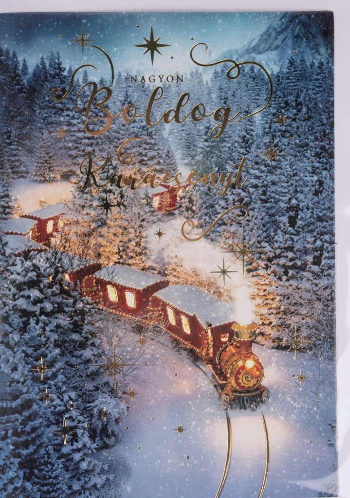 KÉPESLAP+BORÍTÉK, VONAT A HAVAS ERDŐBEN, NAGYON BOLDOG KARÁCSONYT FELIRAT