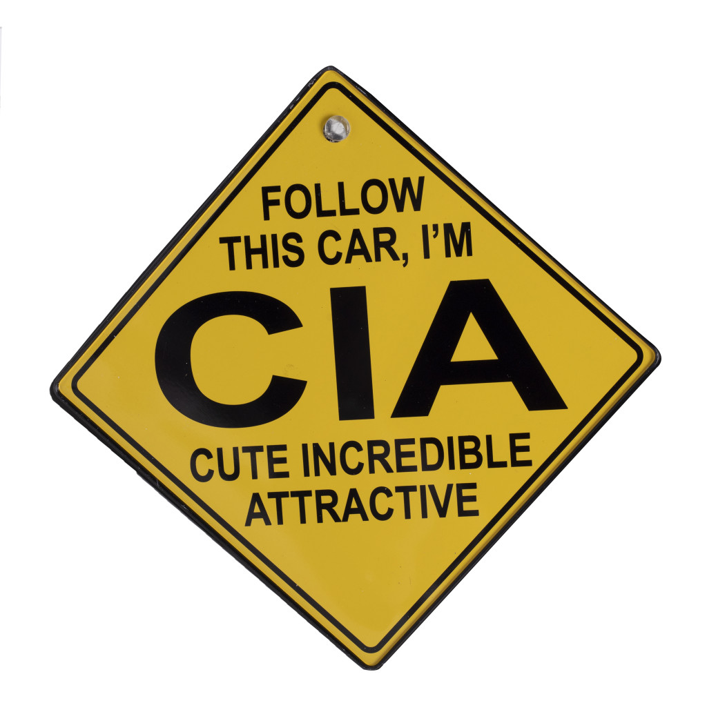 KRESZ TÁBLA FOLLOW THIS CAR, I'M CIA, CUTE INCREDIBLE ATTRACTIVE FELIRAT